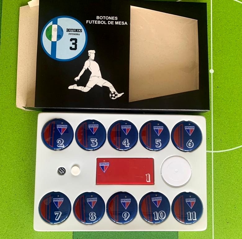 Jogo de botão 45mm, com 1 goleiro, 1 palheta e 2 bolinhas, material em acrilico e decalque.